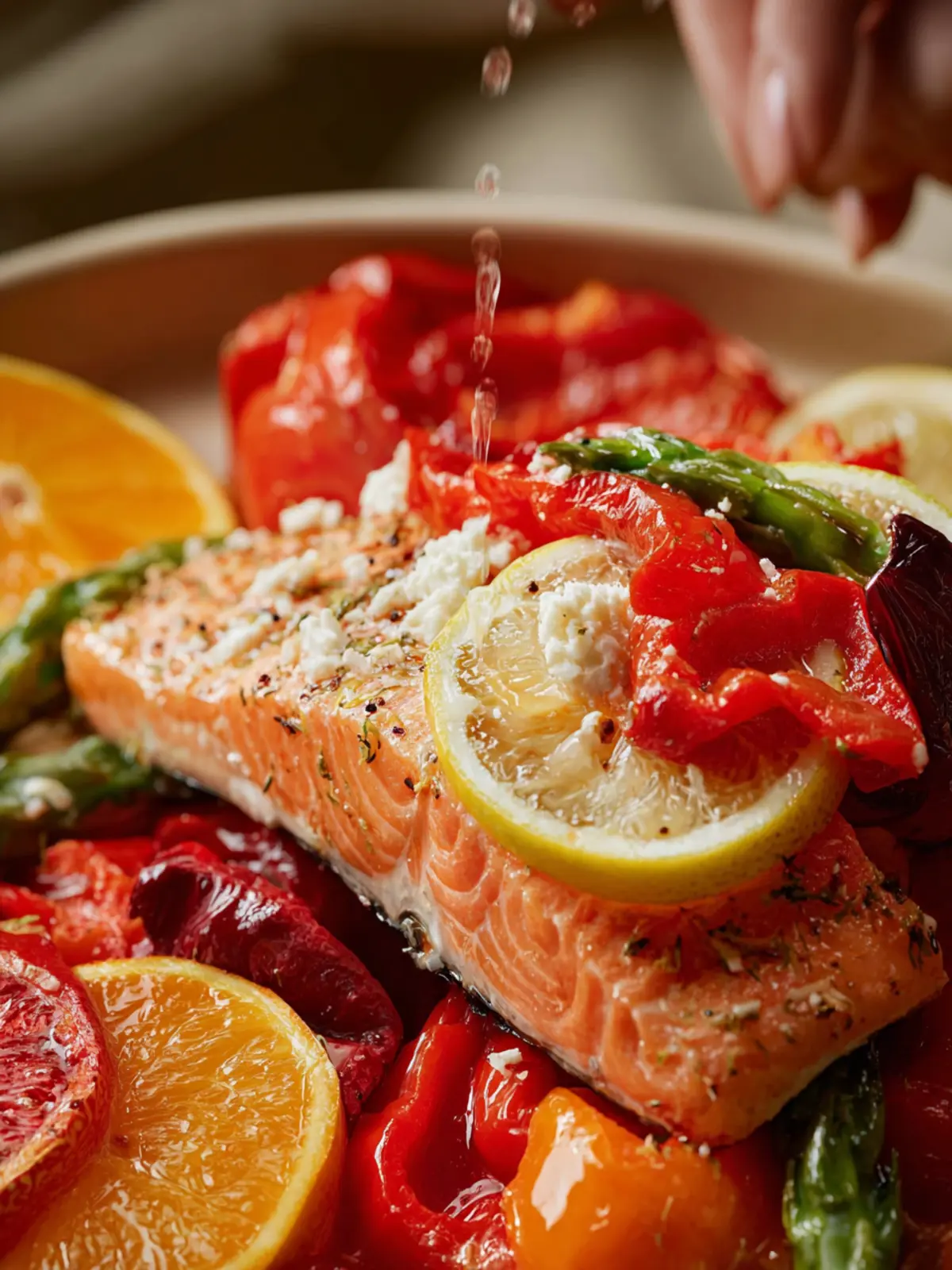 - To a small baking dish, add the remaining slices of tomato, red bell pepper, green bell pepper and spicy red pepper. Sprinkle the dried oregano and a few turns of ground pepper over top of peppers in the baking dish.