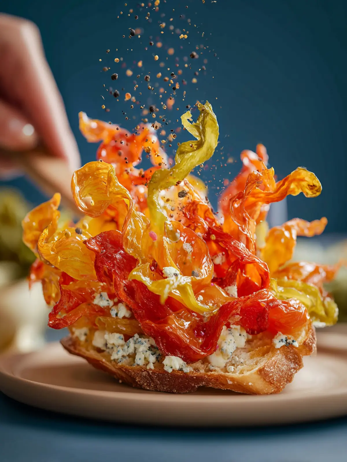 A delicious baked feta dish topped with vibrant peppers and served with toasted sourdough.