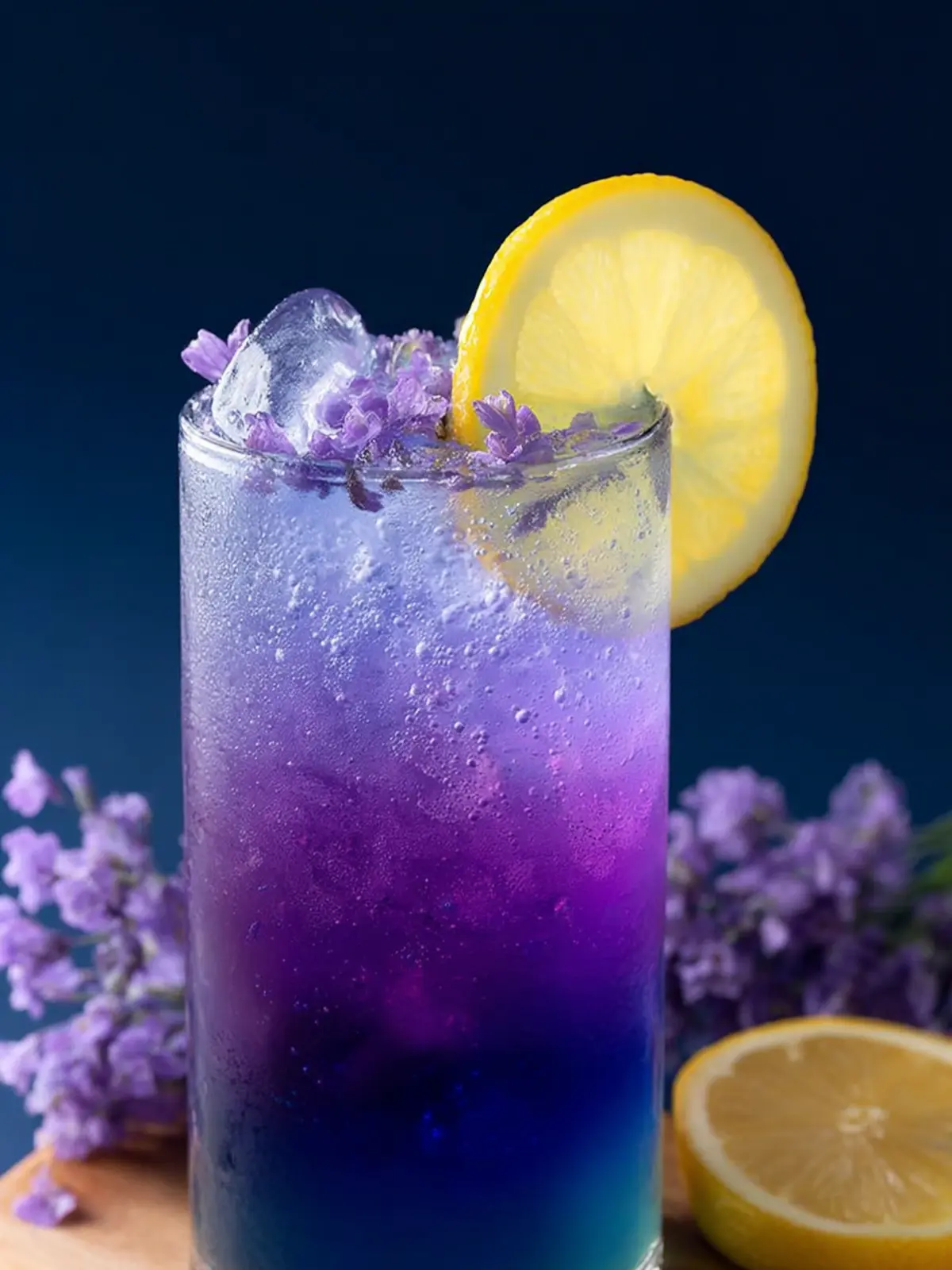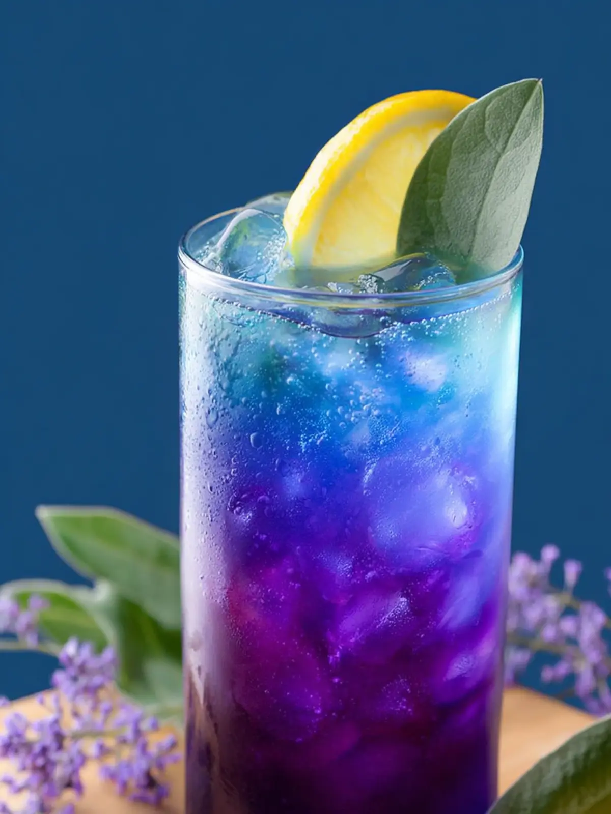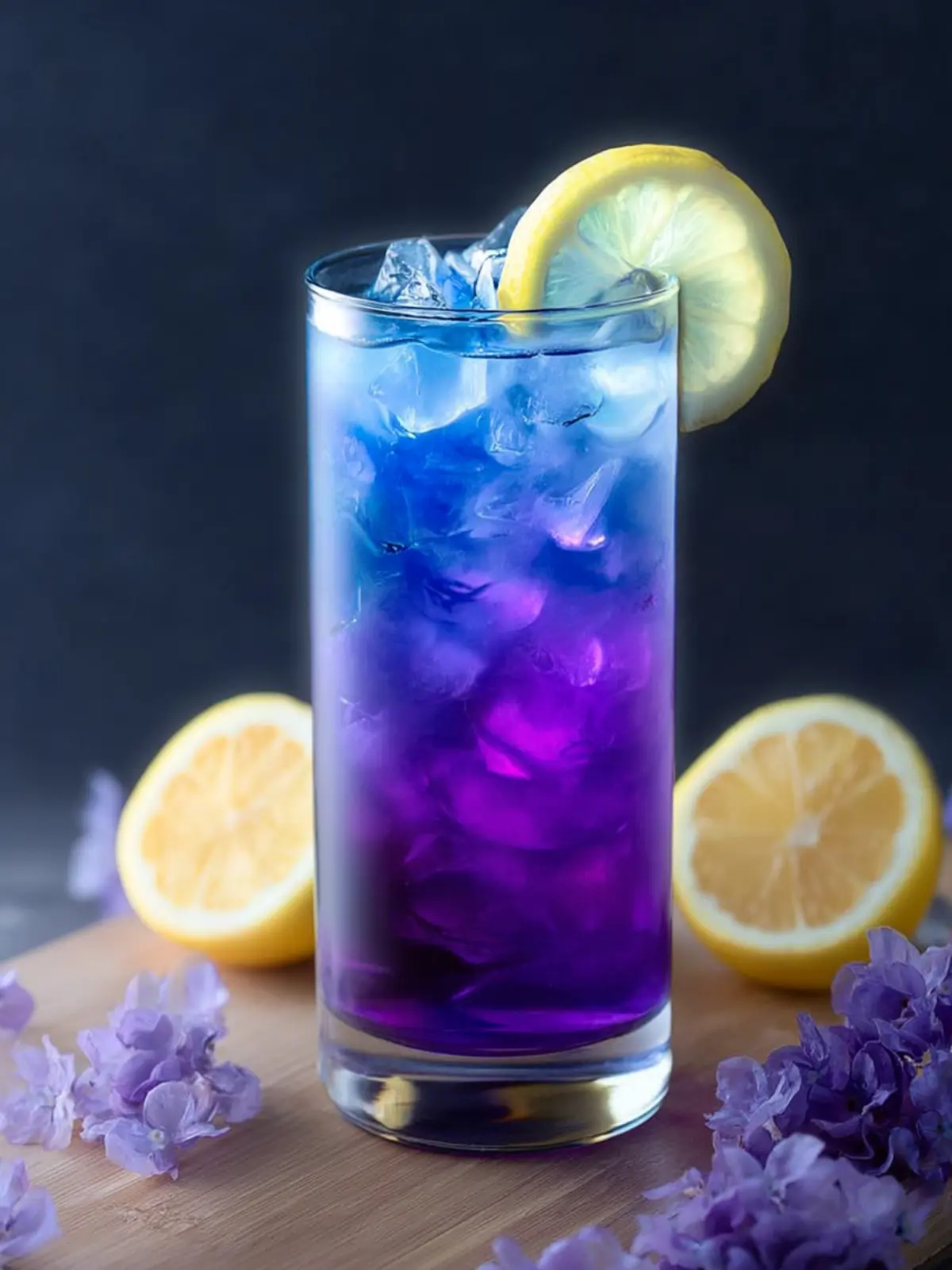 A refreshing and vibrant lemonade made with butterfly pea flowers that change color when lemon juice is added.
