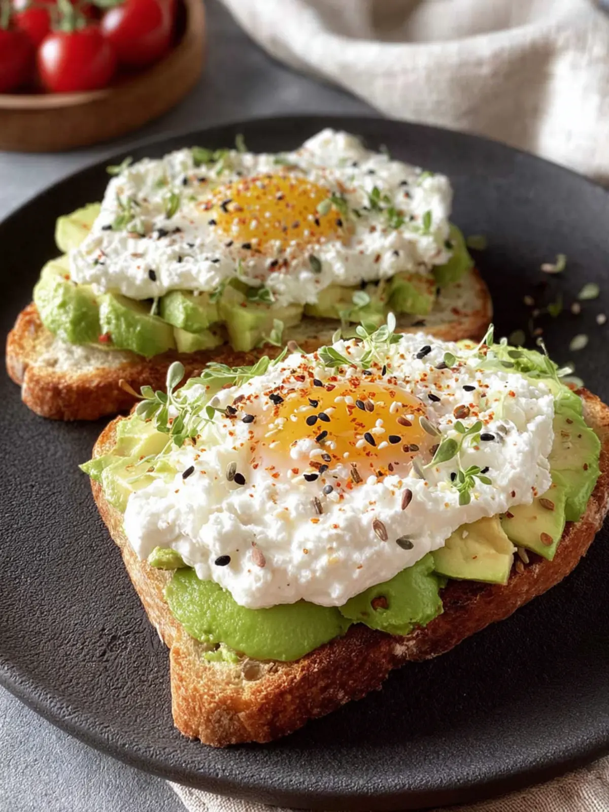 This toast isn’t just delicious; it’s also packed with nutrients. Cottage cheese is loaded with protein, making it an excellent choice to fuel your morning or replenish energy post-workout. Avocados, bursting with healthy fats and fiber, add a satisfying creaminess that keeps you feeling full longer. It’s like having your breakfast and your health goals met all at once!