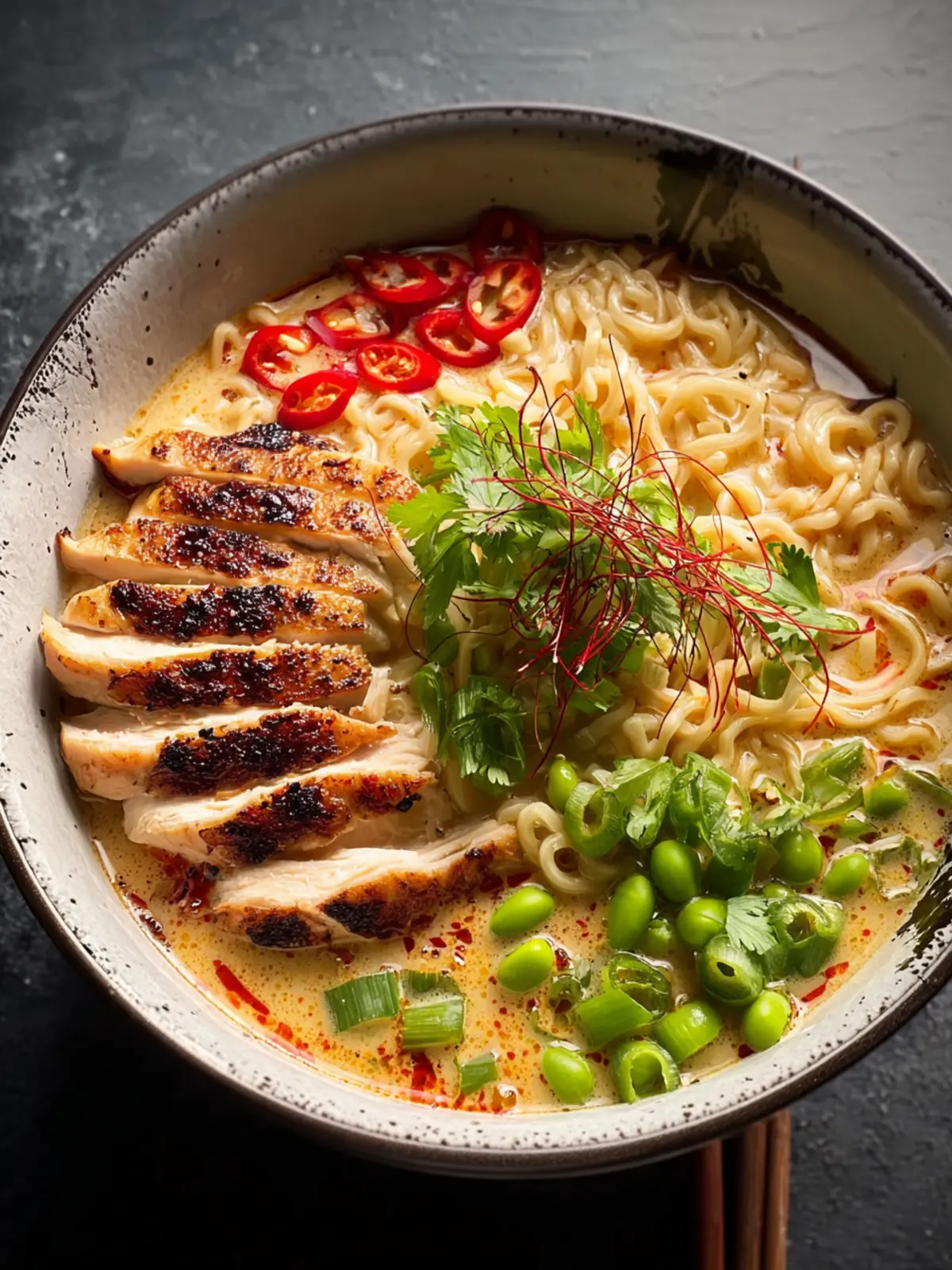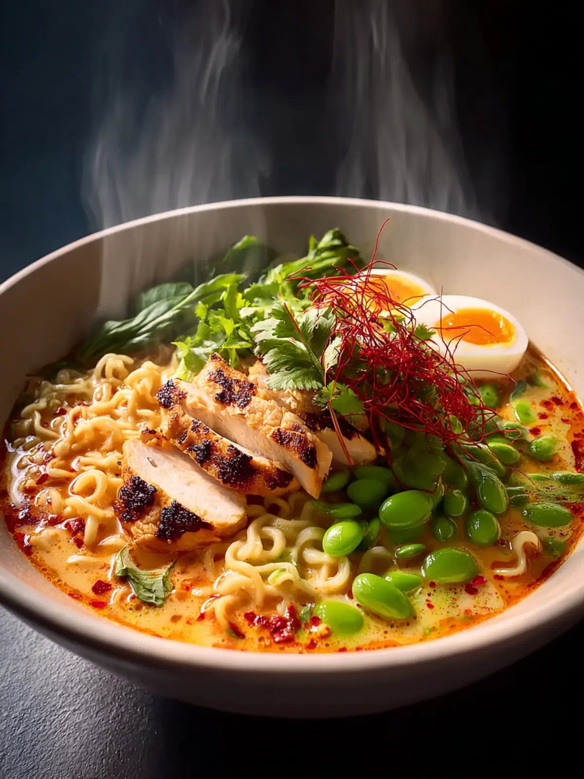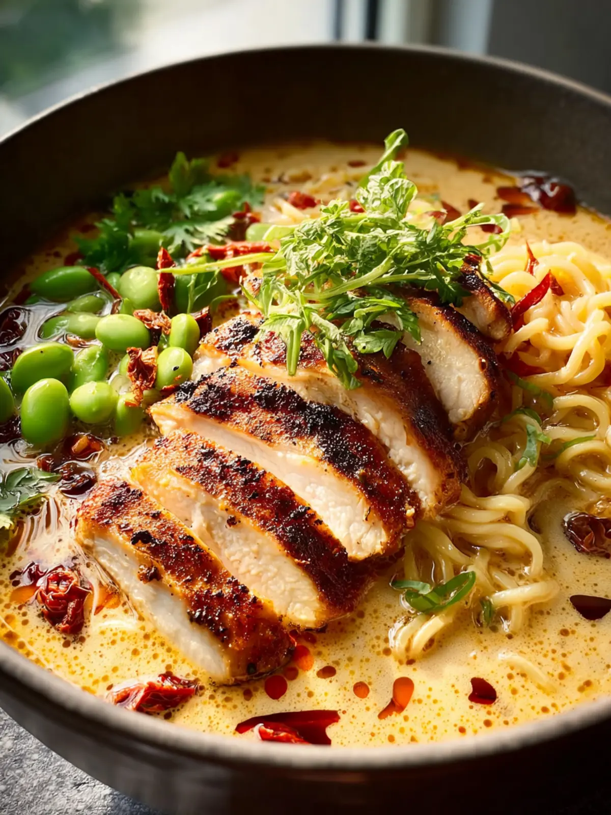 A rich and creamy ramen with tender chicken thighs, fresh veggies, and flavorful broth.