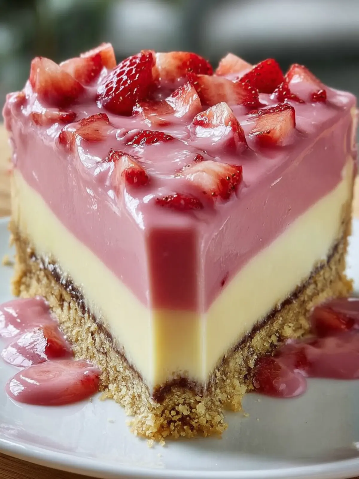 A delicious layered dessert combining creamy custard, fresh strawberries, and a crunchy graham cracker crust.