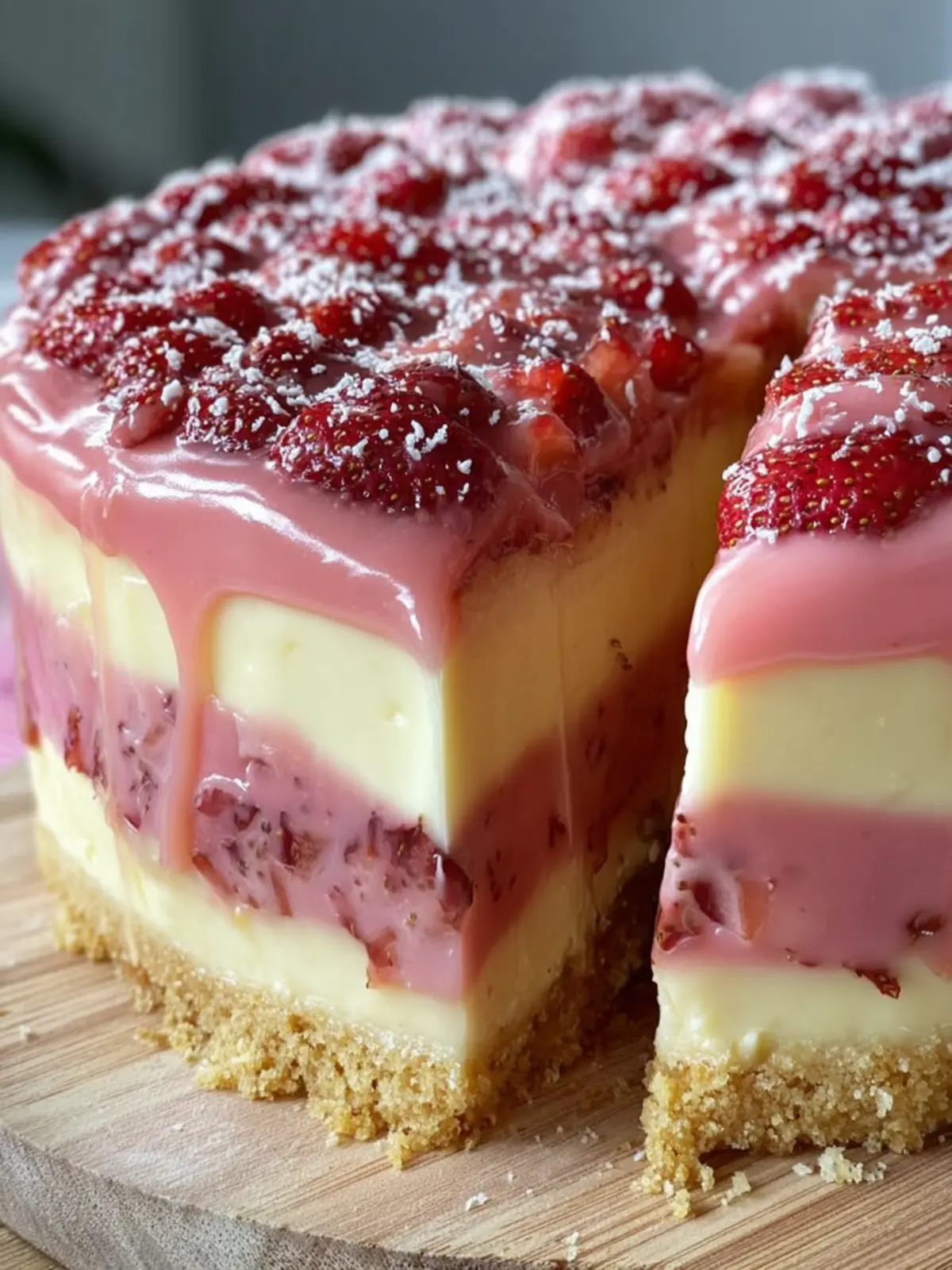 A layered strawberry custard cake is more than just a dessert; it’s a celebration of flavors and textures. The soft sponge layers, combined with luscious custard and fresh strawberries, create an irresistible treat that is sure to impress at any gathering. Whether you’re hosting a birthday party or simply indulging in a sweet moment at home, this cake is bound to be a crowd-pleaser. And remember, allowing the cake to chill not only enhances the flavors but also makes cutting into those beautiful layers a delightful experience. Bake, slice, and enjoy every delicious bite of this magnificent creation!