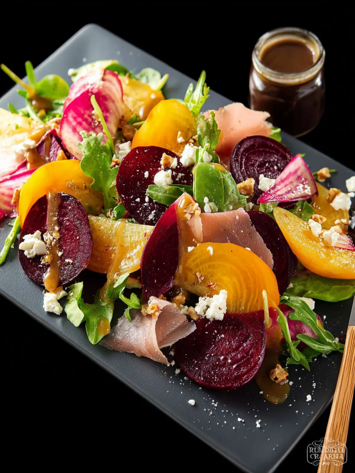 A delicious salad featuring roasted beets, arugula, and a tangy balsamic vinaigrette.