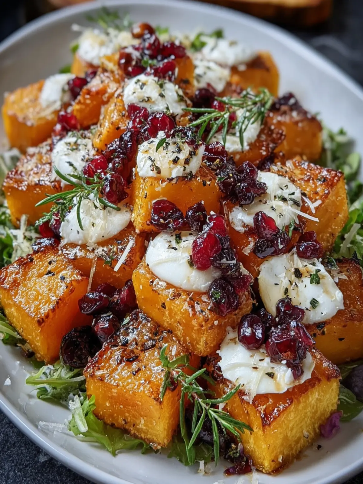 A delicious and healthy roasted butternut squash salad topped with creamy ricotta and sweet cranberry sauce.