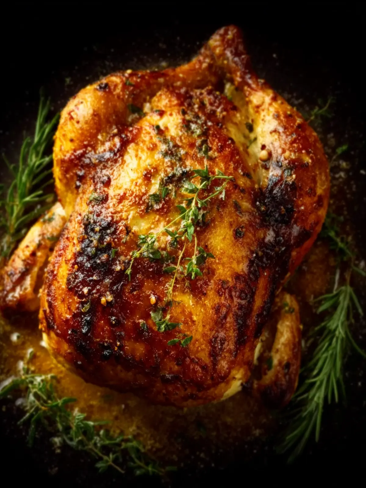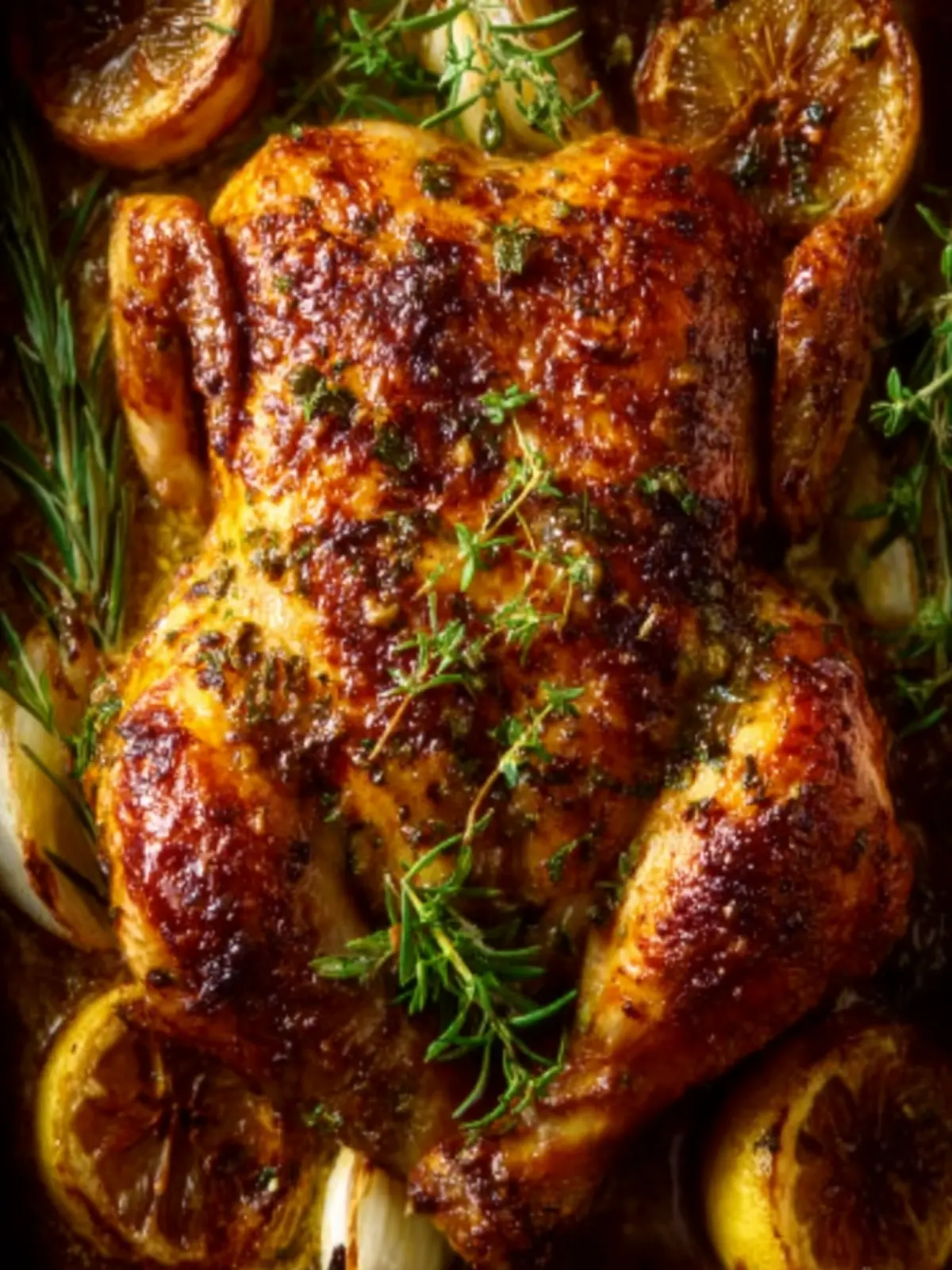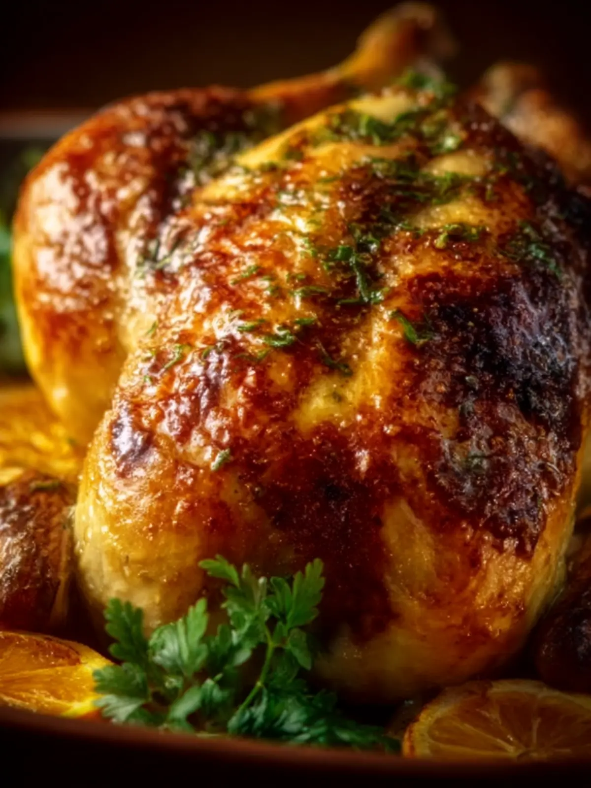 A deliciously roasted whole chicken with a zesty orange glaze, perfect for a family dinner.