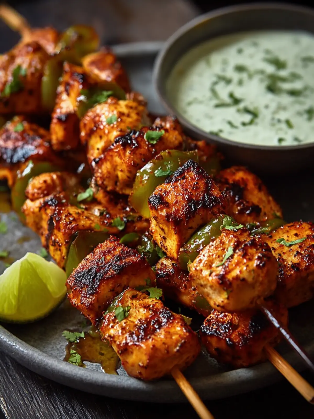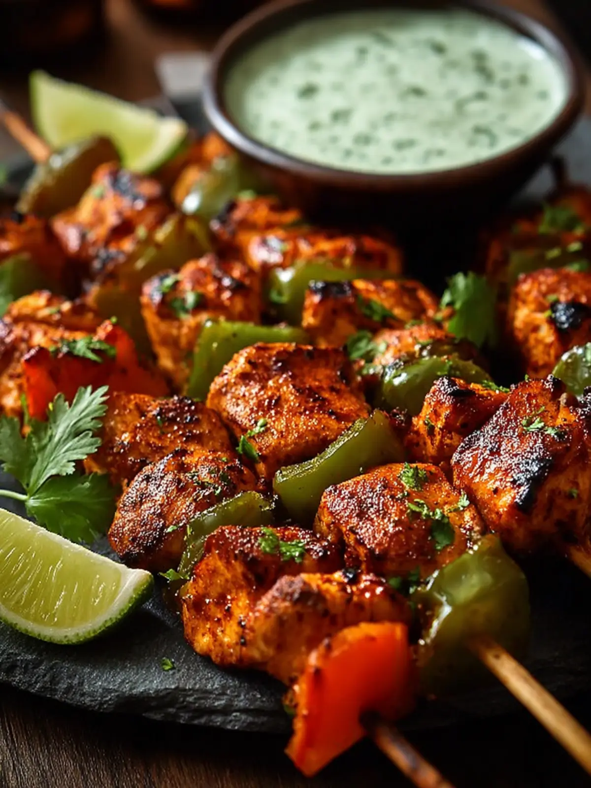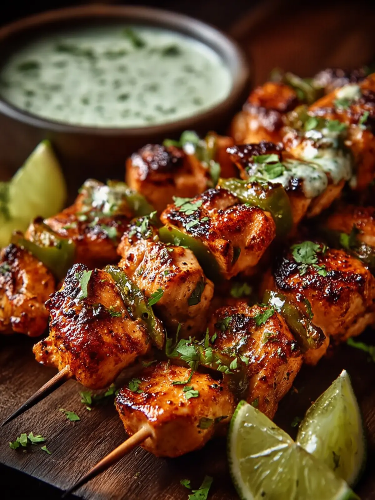 Delicious grilled chicken skewers marinated in a sweet and spicy sauce, served with a refreshing cilantro lime dip.